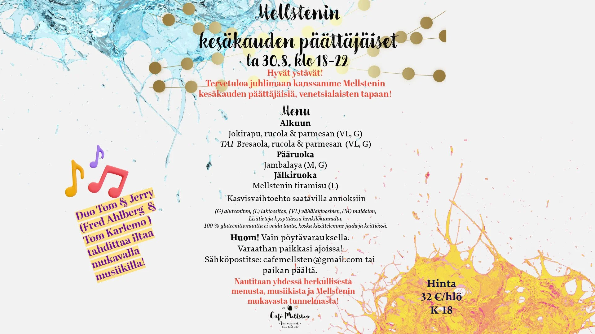 Varaa paikkasi ajoissa Mellstenin kesäkauden päättäjäisiin, joita juhlimme venetsialaiseen tapaan! Aloitamme klo 18 ja meitä viihdyttää mukavalla musiikilla Duo Tom & Jerry (Fred Ahlberg & Tom Karlemo). Lämpimästi tervetuloa! Pöytävaraus (32 €/hlö, K-18) paikan päältä tai sähköpostitse cafemellsten@gmail.com